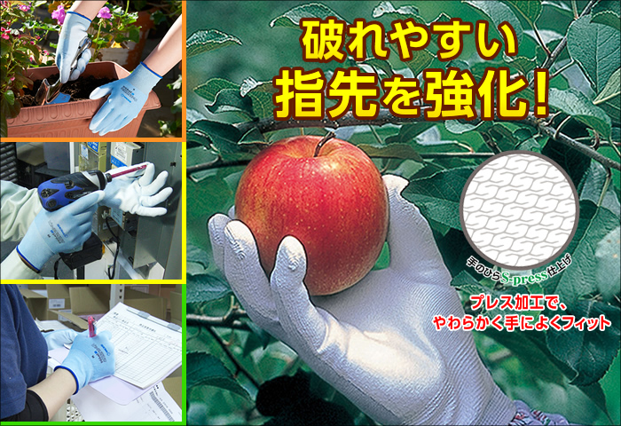 特殊配合のポリウレタンで、指先を強化! “S-press仕上げ”で、やわらかくフィット。