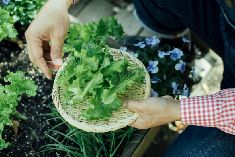 一方で家庭菜園は、15cm程度の狭い間隔で植えても大丈夫。隣り合う苗と葉が触れ合うくらいに成長したら、外側の葉を摘んで収穫します。翌日にはまた新しい葉が出ているので、また収穫して。生きた野菜を常にストックし、食べるときに必要な分だけ採る、いわば「野菜のいけす」が家庭菜園なんです。
