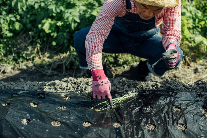 そして、畑仕事の必需品といえば手袋です。例えばタマネギの植え付け。こうして指で土に穴を開けては植え、開けては植えを繰り返すので、素手ではすぐに指先が痛くなる。ほかにも、鎌を使うとき、時期が終わった苗の根っこをほぐすとき、トゲのある樹木の手入れをするときにも手袋は欠かせません。